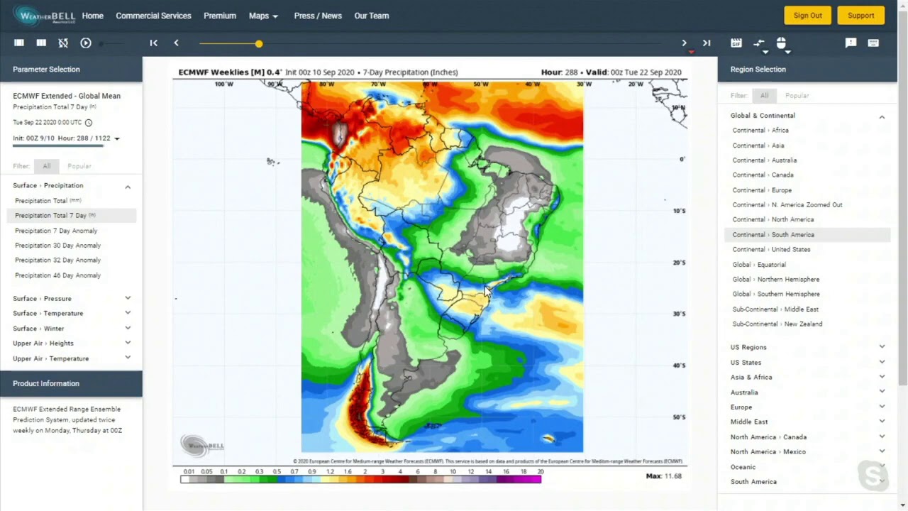 As previsões indicam chuvas iniciais de 5 mm, mas com o correr dos dias elas tenderão a superar 40 mm, notadamente sobre a região de Naviraí (MS). Na sequencia, está prevista a entrada de uma nova frente, no dia 26, com força suficiente para levar chuvas por todo o Estado de S. Paulo e Sul de Minas (Região de cafezais). Daí prá frente, na virada do mês, as chuvas serão copiosas, avançando sobre o centro-oeste (faixa da BR-163), garantindo uma safra com boa umidade. Já o Matopiba tenderá a receber chuvas mais tarde, ao fim de outubro, repetindo um calendário semelhante ao registrado na safra passada.